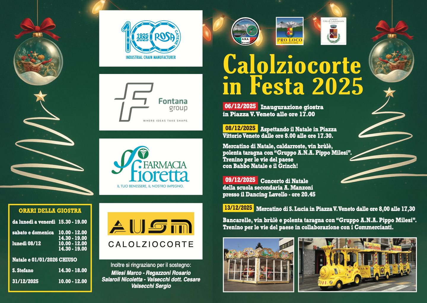 Andando dritti al sodo, il pezzo forte del Natale calolziese sarà una giostra per bambini, interamente coperta e grande 10 metri, che verrà montata nei prossimi giorni in piazza Vittorio Veneto. La struttura, pagata interamente dalla Pro loco grazie alla collaborazione di oltre 50 sponsor del territorio, sarà inaugurata sabato, 6 dicembre alle ore 17, e sarà aperta fino al 6 gennaio praticamente tutti i giorni. Un vero regalo alla città.
