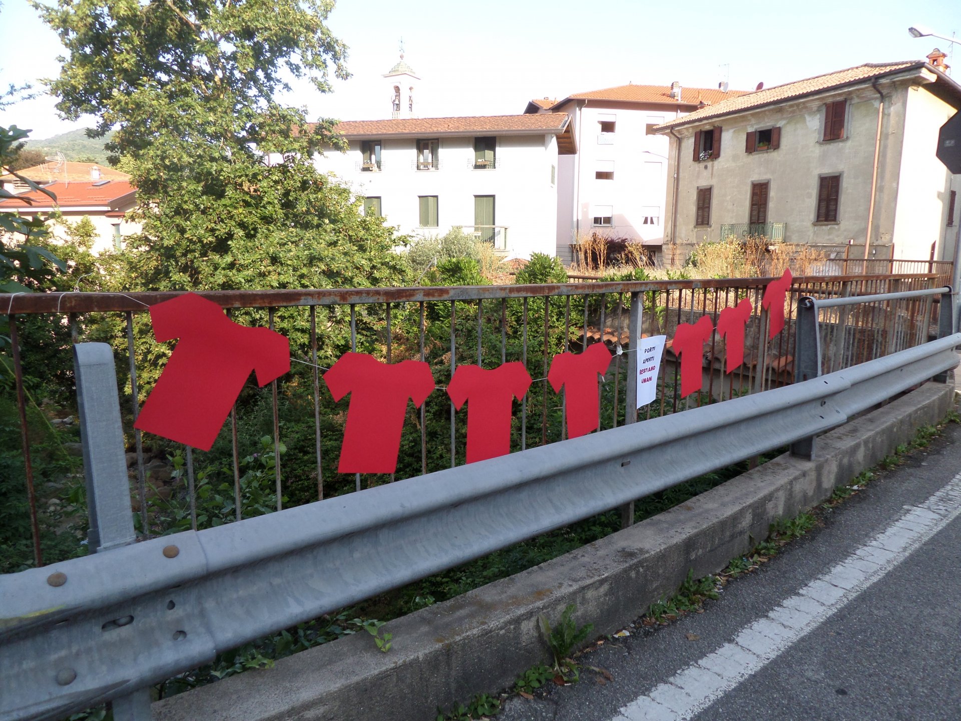 “Raccogliendo con piena condivisione l’appello lanciato da Libera e sottoscritto fra l’altro anche dall’Arci, dall’Anpi, da Legambiente, da Medici Senza Frontiere, da Amnesty International, abbiamo con un flash mob esposto alcun sagome di magliette rosse sul ponticello della Serta a Foppenico. Abbiamo scelto questo ponticello storico di Calolziocorte non solo per fermare l’emoragia di umanità indicata da Libera, ma anche per rimarcare la necessità di costruire ponti e non muri. Porti aperti per restare umani”