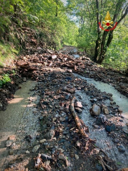 Interrotta una via agrosilvopastorale che porta ad alcune baite. Proprio in una di queste baite si trovava un gruppo di persone per festeggiare un compleanno, tra di loro una disabile che è stato trasportato fuori dai Vigili del Fuoco.