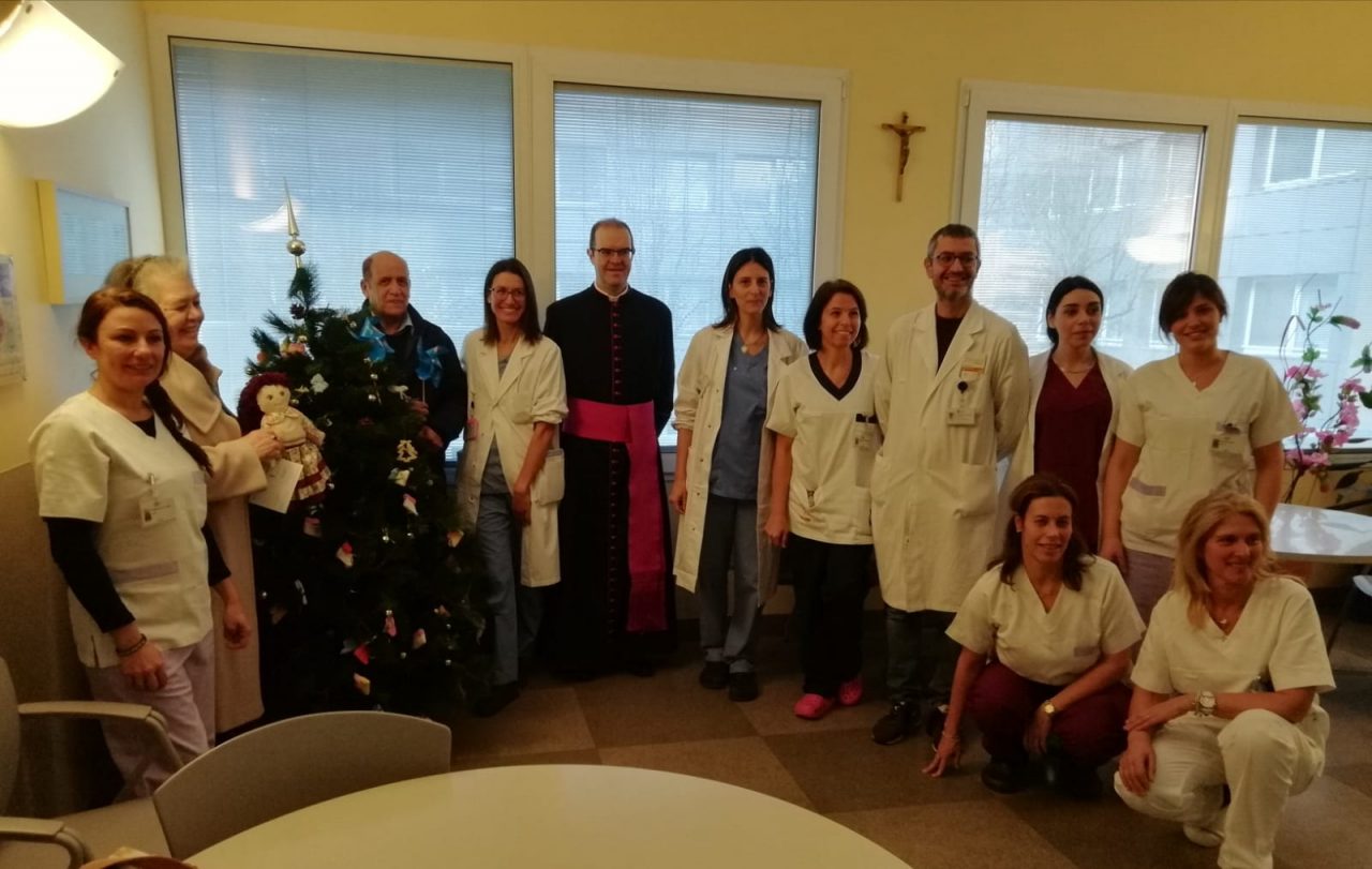 Monsignor Davide Milani, Angelo Fontana e Anna Maria Navielli con il personale medico e paramedico del reparto Martenità dell'ospedale Manzoni di Lecco