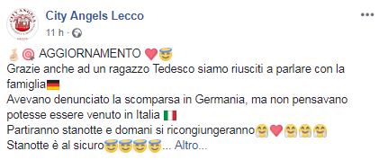 L’aiuto di tutti, sottolineano i City Angels Lecco, è stato fondamentale per aiutare questo signore. Oggi forniranno ulteriori informazioni in merito al suo ritorno.