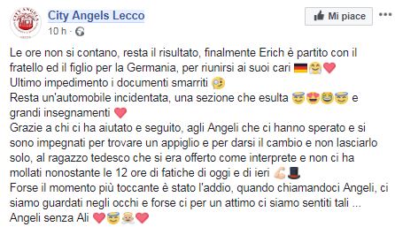 Erich è riuscito a tornare a casa grazie al lavoro svolto dai City Angels Lecco, che sono stati davvero i suoi angeli custodi. Sono tantissime le persone che, tramite la pagina Facebook, continuano a congratularsi con loro per questo splendido risultato: “Complimenti”, “Queste sono le notizie che vorremmo leggere. Grazie a voi e al contributo che date a questa nostra società”, “Ottimo esempio di Solidarietà ed Efficienza per mostrare all’estero che in Italia ci sono Associazioni composte da Persone in Gamba veri Angeli”.