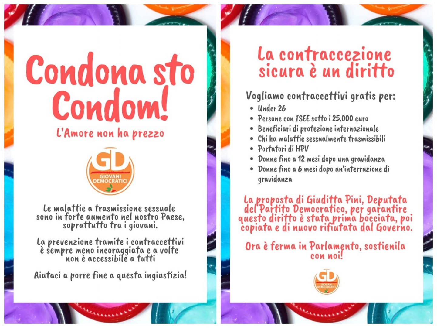 La mobilitazione, oltre a incoraggiare l’uso della contraccezione contro la diffusione delle malattie sessualmente trasmissibili, ha riguardato la campagna nazionale “L’amore non ha prezzo”. Attraverso lo slogan “Condona sto Condom!”, l’iniziativa dei Giovani Democratici si propone di assicurare il diritto alla contraccezione sicura sostenendo la proposta della Deputata PD Giuditta Pini volta a garantire contraccettivi gratis per: under 26, persone con ISEE sotto i 25.000 €, beneficiari di protezione internazionale, persone con malattie sessualmente trasmissibili, portatori di HPV, donne fino a 12 mesi dopo una gravidanza e donne fino a 6 mesi dopo un’interruzione di gravidanza. “I dati delle nuove infezioni da HIV sono preoccupanti, soprattutto per i giovanissimi (15-24 anni) e per la nostra regione (prima in Italia nel 2017). Noi crediamo che la risposta debba partire da un’educazione senza tabù e da una prevenzione accessibile a tutti”.