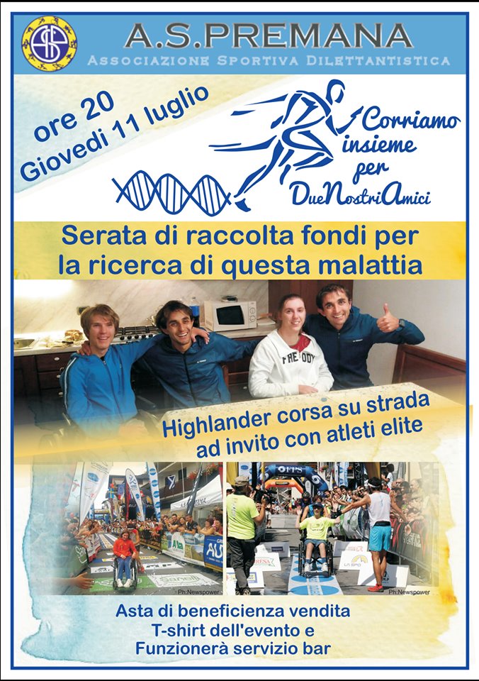 “Samuel e Gloria siamo tutti noi. Le loro speranze sono le nostre. Qualcosa è già stato fatto, ma vogliamo fare ancora di più; questi studi forse non salveranno Gloria e Samuel, ma rappresentano un inizio. Con la pubblicazione dello studio si spera di trovare qualcuno nel mondo che abbia vissuto questa esperienza, e che possa quindi aiutare la ricerca ad uscire da questo vuoto”. È questo l’obiettivo delle tante iniziative di solidarietà promosse dall’intera comunità di Premana. Nei mesi scorsi il concerto organizzato dal coro Nives nella chiesa parrocchiale di Premana, che ha consentito di raccogliere quasi seimila euro, ora, nel paese del canto, delle forbici, ma anche della corsa, nasce CORRIAMO INSIEME PER IL DNA, una manifestazione di corsa su strada ad invito, nella spettacolare formula highlander, ovvero corsa ad eliminazione, in cui ad ogni giro l’ultimo atleta viene eliminato dalla competizione.