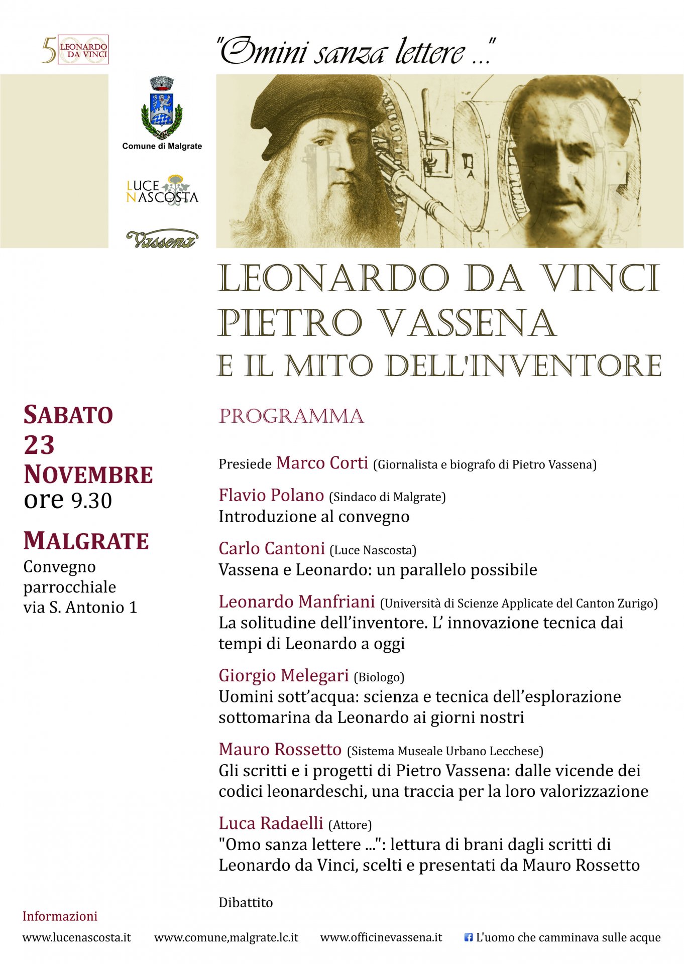 Applicate del Canton Zurigo, Giulio Ernesto Melegari biologo, speleologo e esploratore subacqueo con batiscafi e sommergibili, e l’attore Luca Radaelli che leggerà brani dagli scritti di Leonardo da Vinci, scelti e commentati da Mauro Rossetto. Presiederà i lavori Marco Corti, giornalista e biografo di Pietro Vassena, da anni impegnato nella raccolta e nella ricerca di documenti e testimonianze sulla vita dell’inventore malgratese.