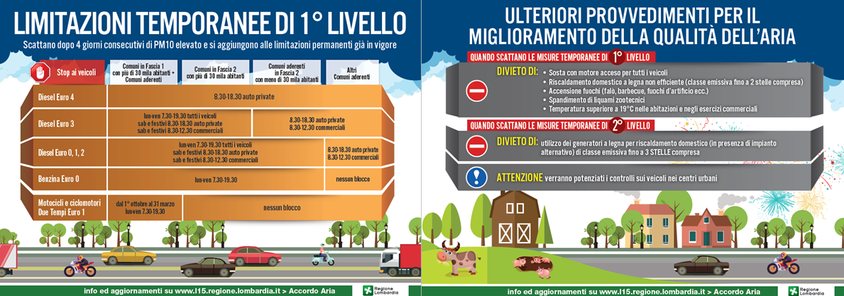 Sulla pagina di attivazione e disattivazione delle misure di limitazione temporanee del sito di Regione Lombardia, è possibile consultare quotidianamente i livelli medi di PM10 per provincia e sapere in qualsiasi momento se stanno per essere attivate o sono attive oppure non attive le misure temporanee. Sullo stesso sito sono inoltre reperibili: l’elenco dei Comuni coinvolti, la mappa dei Comuni e i provvedimenti regionali.