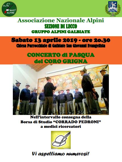 La borsa di studio, intitolata alla memoria del Tenente medico “Corrado Pedroni”, verrà consegnata dal presidente dell’Ana di Lecco, Marco Magni, alla dottoressa Baglio nel corso di una serata prevista per sabato 13 aprile, nella chiesa parrocchiale di San Giovanni Evangelista di Galbiate, durante la quale si esibirà il coro alpino “Grigna” per il concerto di Pasqua. Alla serata saranno presenti numerosi gruppi alpini del territorio, unitamente alle autorità civili e religiose.