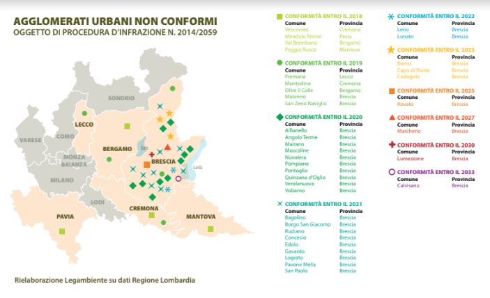 Dei 37 agglomerati in procedura infatti, 4 troveranno risoluzione entro il 2018, 5 entro il 2019, 10 entro il 2020, 9 nel 2021, 2 nel 2022, 3 nel 2023, 1 entro il 2025, 1 nel 2027, 1 nel 2030 e 1 nel 2033. “Sempre che i tempi di progettazione e realizzazione vengano rispettati” ribattono da Legambiente.