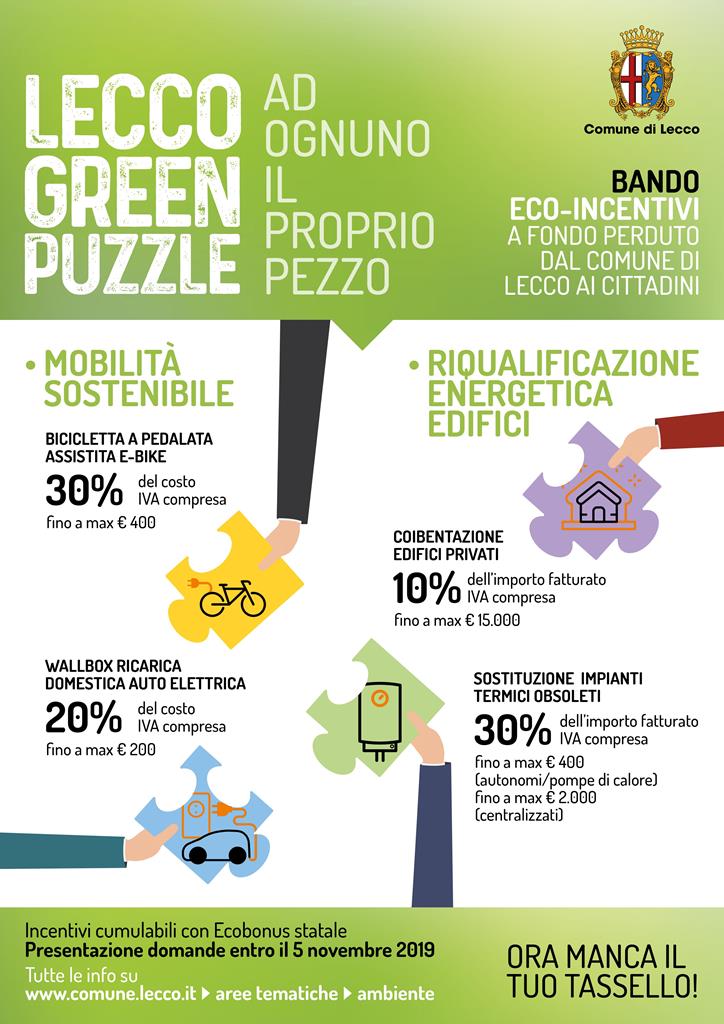 Ancora venti giorni per accedere ai contributi di “Lecco Green Puzzle: a ognuno il proprio pezzo”, il bando per ottenere gli eco-incentivi a fondo perduto che il Comune di Lecco offre ai cittadini per promuovere la mobilità sostenibile e la riqualificazione energetica degli edifici. È possibile presentare domanda fino alle ore 12 di martedì 5 novembre 2019.