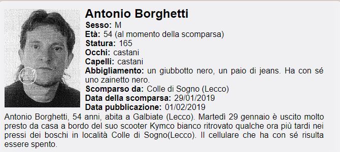 E’ Antonio Borghetti, 54 anni, residente a Galbiate nella frazione di Villa Vergano lo scomparso di Colle di Sogno. Sul sito della nota trasmissione Chi L’ha Visto di Rai 3 (qui il sito ufficiale) è stato pubblicato un appello che va supportare le ricerche dell’uomo scomparso da casa martedì scorso.