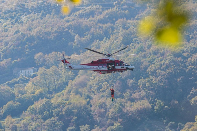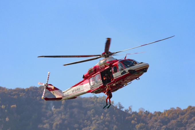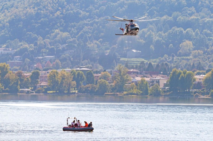 Elicottero e gommone dei Vigili del fuoco sul lago