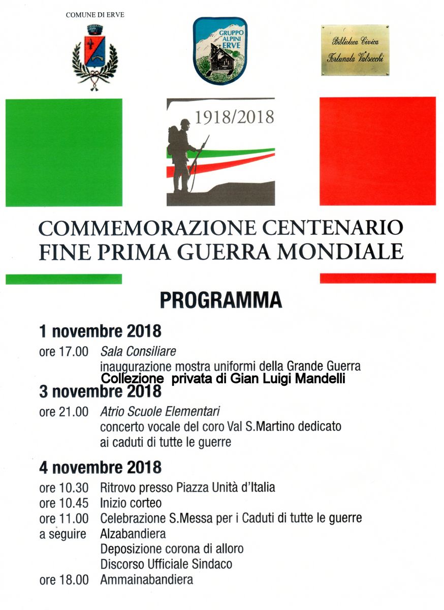 Il Comune di Erve, in collaborazione con il gruppo alpini e la biblioteca civica, ha organizzato una serie di eventi per la commemorazione del centenario della fine della prima Guerra Mondiale nel 1918.