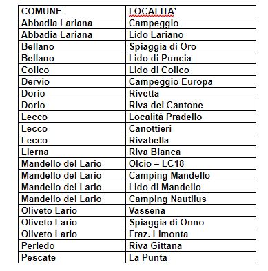 La maggior parte dei lidi sono risultati favorevoli sia per i parametri microbiologici che per quelli algali (cianobatteri) per le località sotto indicate che, quindi, sono idonei alla balneazione. Due le spiagge bocciate, quella di Inganna a Colico e quella del Laghetto di Piona sempre a Colico.