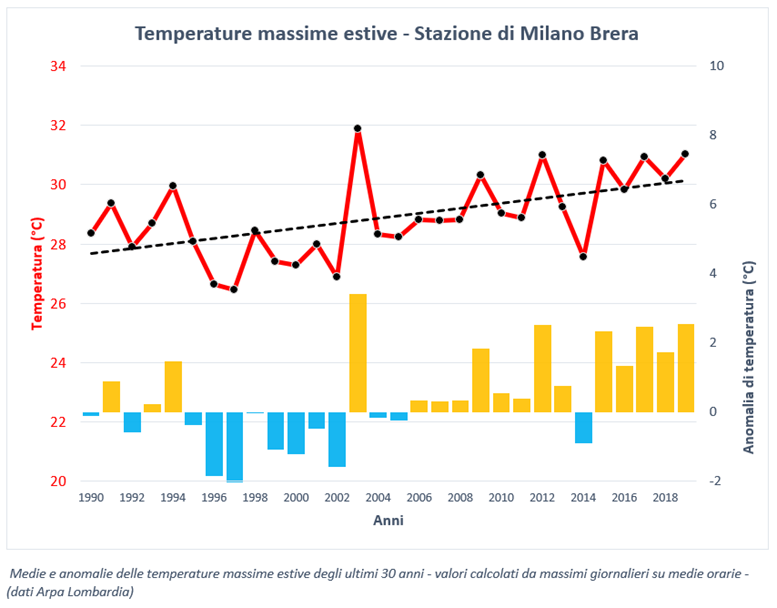 Analizzando nel dettaglio le anomalie estive degli ultimi 30 anni, non solo quella del 2019, si notano valori oltre la media ogni anno a partire dal 2006, con la sola eccezione del 2014 (i valori sono calcolati usando come riferimento il periodo 1981-2010). In rifermento ai valori medi registrati, la tendenza all’aumento è di circa 0,8 °C /10 anni. Analogo risultato lo otteniamo per i valori minimi, con una crescita anche più evidente di oltre 1 °C /10 anni.