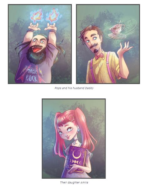 ““Unconventional Fairy Tales for unconventional families”, un libro di fiabe in cui tutti i protagonisti appartengono a famiglie non tradizionali.” spiegano Mattia ed Elisa- “Ci sono famiglie LGBT (Lesbiche, Gay, Bisessuali e Transgender.) con due papà maghi o con due mamme piratesse, un giovane mago che si sente una strega e tante altre ancora” spiegano Mattia ed Elisa. Una delle protagoniste ad esempio è Amira. La bimba “ha due fantastici padri, papà e papà, che sono anche potenti stregoni! Con potenti incantesimi e un cane che fa volare le pallottole, la aiuteranno a fare amicizia con il nuovo bambino a scuola” .