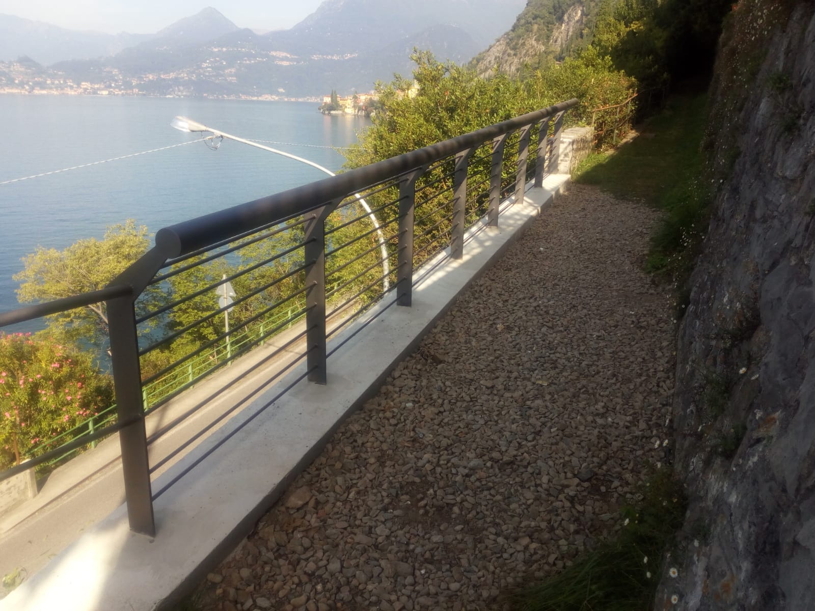 “L’intervento si è articolato in due fasi” spiega il sindaco di Varenna Mauro Manzoni. “Dapprima si sono ancorate le reti su tutta la roccia interessata dalla frana, sono stati realizzati alcuni “puntoni” in calcestruzzo, sui quali sono stati posizionati ulteriori tiranti, per consolidare il fronte roccioso. Quindi si sono completati i lavori, provvedendo a realizzare il rivestimento della muratura che sostiene il sentiero pedonale soprastante, collocando un nuovo parapetto a protezione dello stesso, oltre alle opere di finitura. Della seconda, risultano completati i lavori di riempimento della parte retrostante il muro realizzato in occasione della fase precedente, i rivestimenti in pietra del muro di sostegno del sentiero pedonale, il parapetto in ferro e le opere di finitura e di pulizia definitiva. La sede stradale è stata quindi riaperta completamente”.