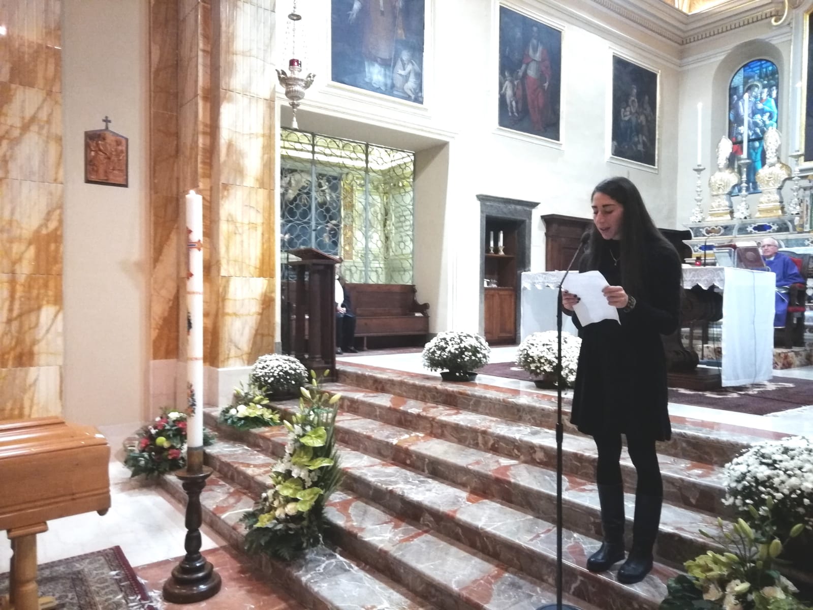 La nipote Cecilia Zambelli, mentre legge il messaggio dei nipoti per il nonno Adriano