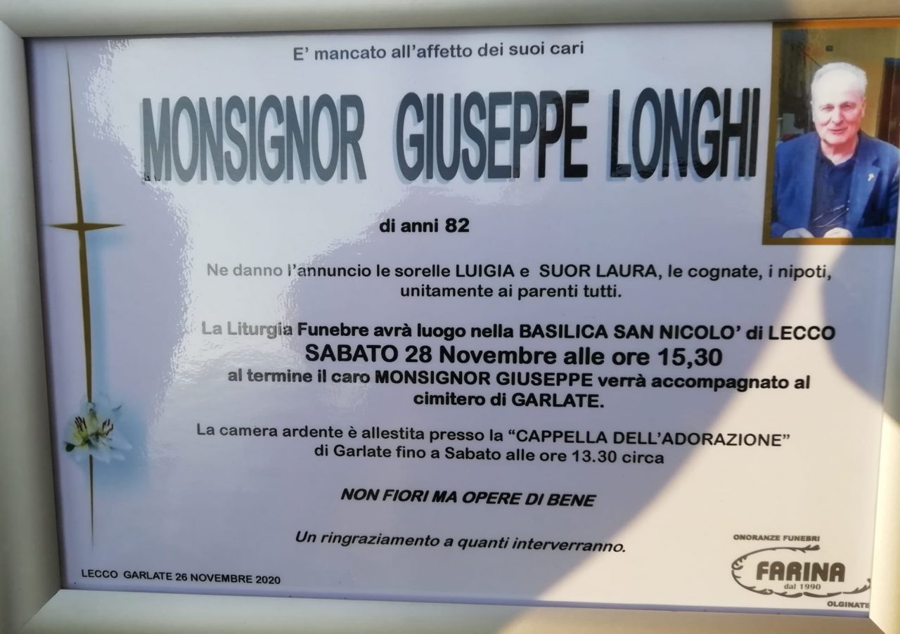 Sono stati celebrati questo pomeriggio, sabato 28 novembre 2020, nella Basilica di San Nicolò a Lecco, i funerali di monsignor Giuseppe Longhi, scomparso a 82 anni giovedì scorso. Era nativo di Garlate.