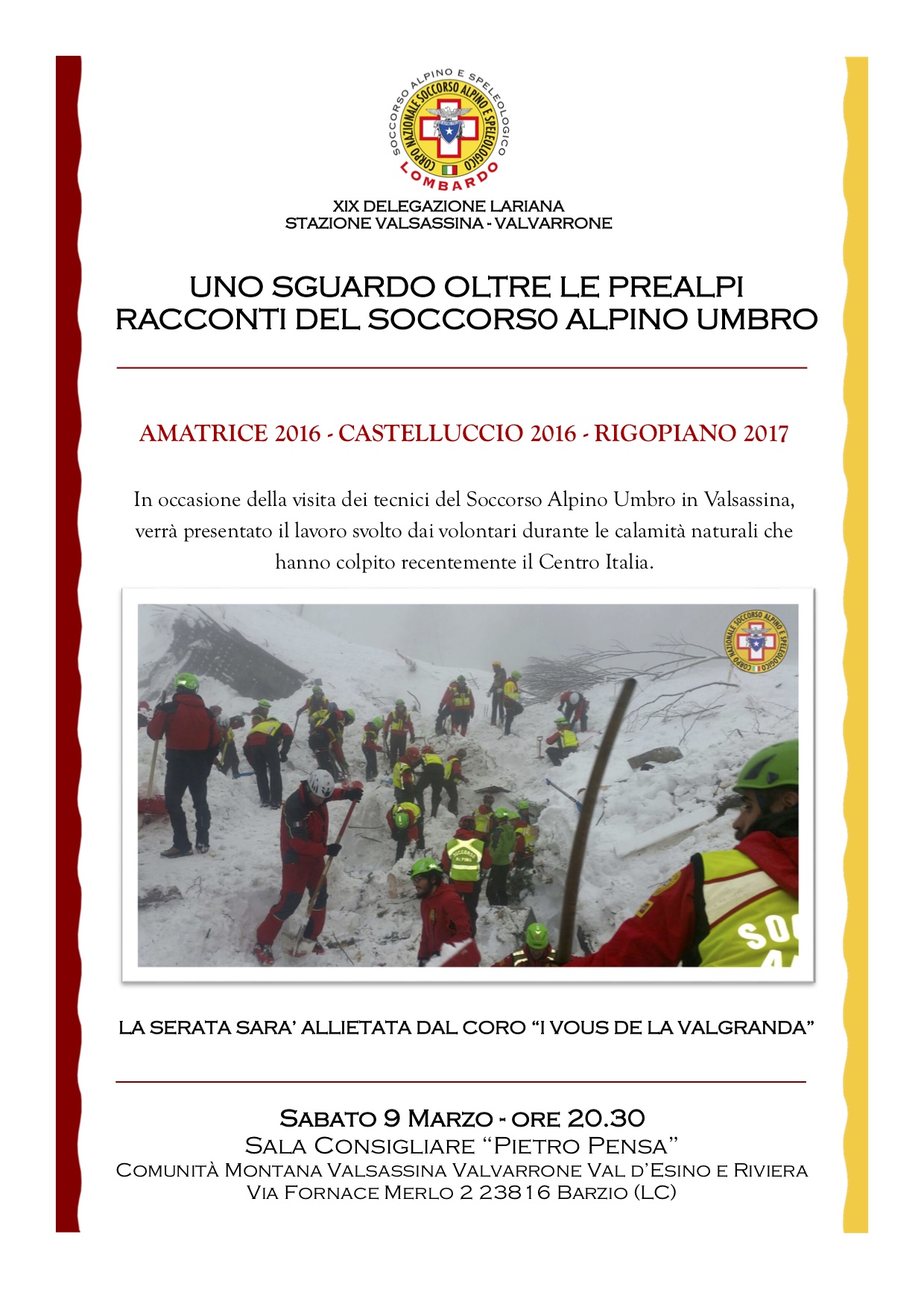 Oltre alla serata di sabato 9, in cui sarà presentato il lavoro svolto dai tecnici durante le calamità naturali, il giorno seguente (domenica 10 marzo) si svolgerà un simulato di soccorso su terreno invernale, per condividere le tecniche e le strategie operative con i colleghi umbri. Appuntamento sabato 9 marzo alle 20.30 nella sala consiliare “Pietro Pensa” della Comunità Montana Valsassina Valvarrone Val d’Esino e Riviera, in Via Fornace Merlo 2, a Barzio (LC) . Durante la serata si esibirà il coro “I vous de la Valgranda”. Il Cnsas ringrazia il presidente e i funzionari la Comunità Montana Valsassina Valvarrone Val d’Esino e Riviera per la disponibilità dimostrata nella concessione degli spazi per svolgere l’iniziativa, come pure il personale d’ufficio e amministrativo.
