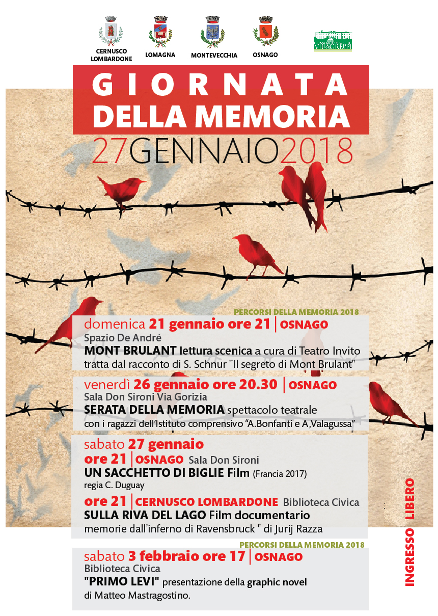 In occasione del 27 gennaio Osnago ospiterà diversi eventi commemorativi, organizzati con la collaborazione del Consorzio Villa Greppi. L’Amministrazione comunale osnaghese, in collaborazione con quelle di Ceernusco, Lomagna e Montevecchia, ha infatti organizzato cinque serate sul tema. Il primo appuntamento si terrà domenica 21 presso lo Spazio De Andrè. A partire dalle ore 21 i locali di via Matteotti ospiteranno infatti “Mont Brulant”, lettura scenica a cura di Teatro Invito.