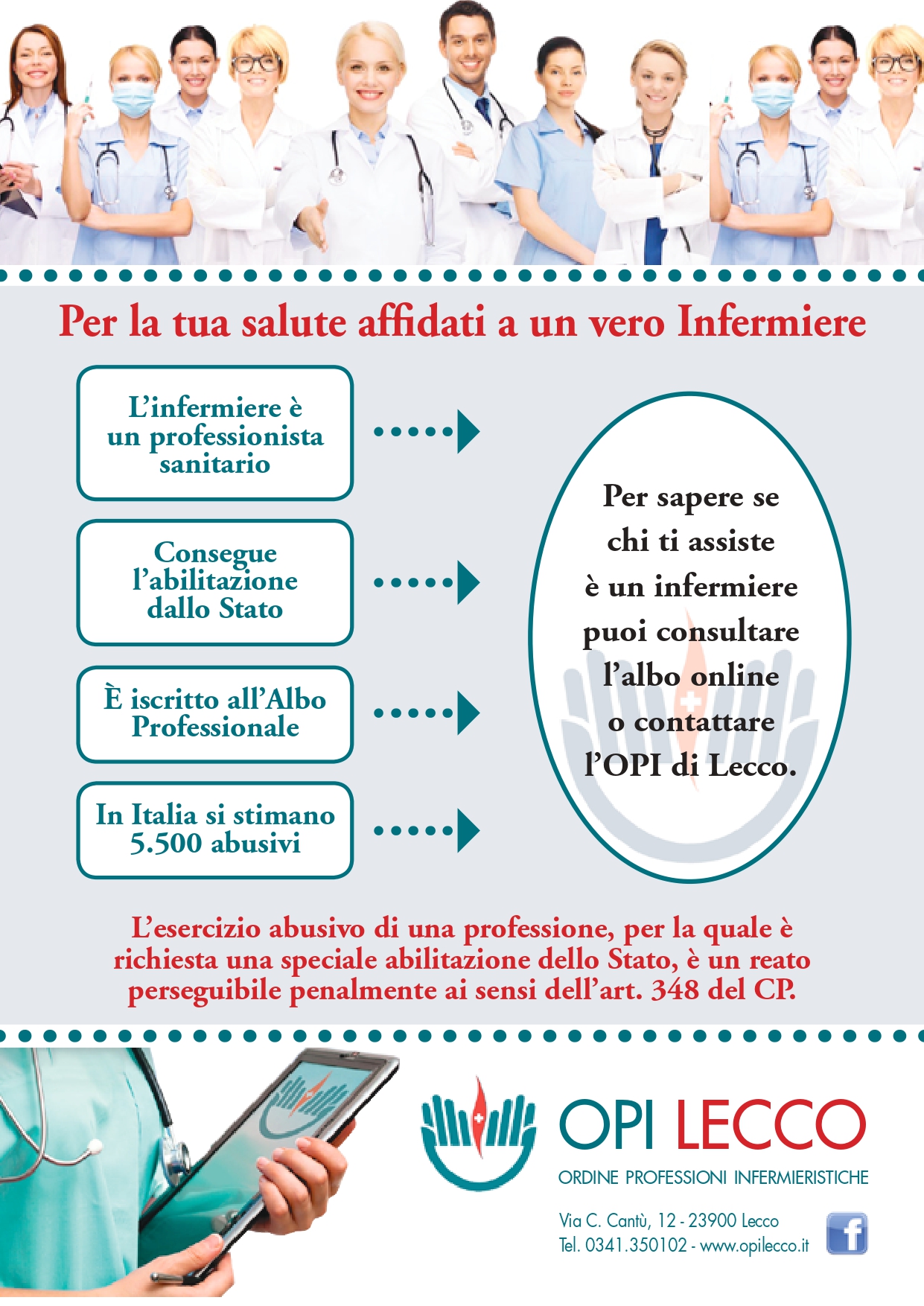 L’Ordine delle Professioni Infermieristiche di Lecco  vuole porre l’attenzione sulle modalità che consentono  a tutti i cittadini di verificare se la persona a cui si stanno rivolgendo è un infermiere qualificato. Nello svolgimento delle proprie funzioni di vigilanza territoriale, l’Opi ricorda che l’esercizio abusivo di una professione, per la quale è richiesta una particolare abilitazione dello stato, è un reato perseguibile ai sensi dell’articolo 348 del Codice Penale. L’invito rivolto è anche quello di segnalare all’Ordine eventuali situazioni non regolari, qualora se ne riscontrassero.