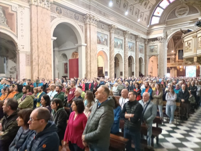 Le due bare, semplici, sono state condotte a spalla dagli amici fino all’altare e circondate di stelle alpine. “Quando la morte sopraggiunge improvvisa, in modo tragico, tutti ci sentiamo uniti – ha detto don Marco nell’omelia – In un’epoca dove sembrano svelati tutti i tabù, davanti alla morte diciamo ‘è volato via’ oppure ‘è venuto a mancare’ e non riusciamo a capire che la morte fa parte della vita. Ma noi non riusciamo ad accettare che tutto debba finire ed è proprio in questo che la fede può vacillare. Quello che stiamo celebrando oggi non è un rito qualunque, ma la Pasqua. Dio non ci chiama a morire ma a vivere”. E ancora: “Le letture che abbiamo ascoltato oggi hanno in comune la parola ‘monte’. la scena del Vangelo si svolge su un monte. L’ incontro con Mosè avviene sul monte Sinai. Nella Bibbia la montagna è un simbolo teologico e avvicina maggiormente a Dio. Ecco perché mi viene da pensare che Massimo e Valentino nel momento della loro morte erano sul monte, più vicini a Dio. Ognuno di noi in montagna si eleva spiritualmente poiché è il simbolo della nostra interiorità, favorita dal silenzio, che possiamo gustare dall’alto di un pendio. Massimo e Valentino, indipendente dal loro credo, hanno cercato di vivere così l’esperienza della montagna. E noi sappiamo che non sono morti ma vivono con il Dio della vita in eterno”.
