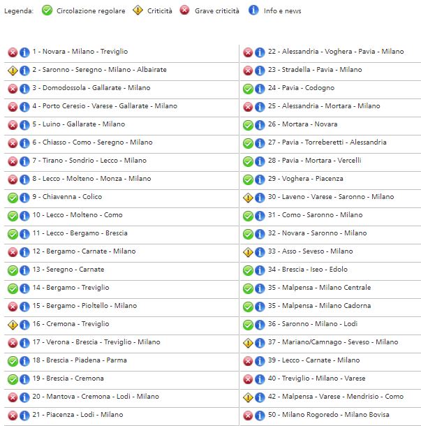 Coinvolte anche le linee utilizzate dai pendolari lecchesi, brianzoli e valtellinesi ovvero la Tirano-Sondrio- Milano- Lecco, la Lecco-Molteno-Monza-Milano, e la Lecco-Carnate-Milano. Ma come detto la problematica e ben più estesa. Ecco la situazione al momento e le linee in tilt