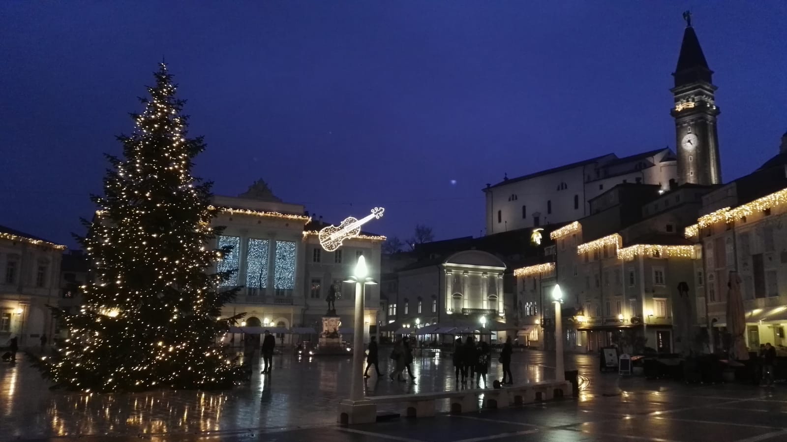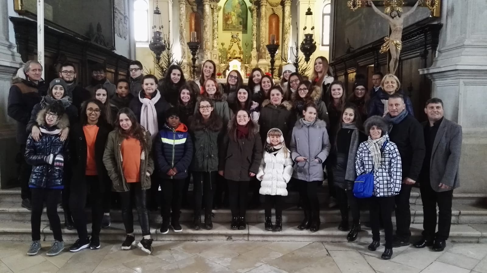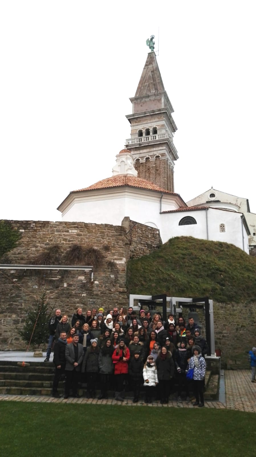 All’arrivo nella cittadina la comitiva è stata accolta nel Convento dei frati Minori di San Francesco. Nel tardo pomeriggio i due cori si sono esibiti nella Chiesa di San Francesco. Ad accompagnare al piano l’esibizione dei ragazzi il professor Guido Parocco. Grande partecipazione da parte del pubblico presente, il tutto reso mistico dalla sacralità del luogo. Il convento infatti, fondato prima del 1301, conserva una ricca collezione di letteratura musicale ed un’antica biblioteca con libri del XV secolo nonché una pinacoteca ricca di opere di pittori veneziani. Il chiostro invece rappresenta uno degli ambienti dotati della migliore acustica della Slovenia e da anni è sede di numerosi eventi musicali di alto livello. Al termine dell’esibizione la professoressa Menghini ha omaggiato il maestro Grbec con il dolce tipico natalizio italiano: il panettone.