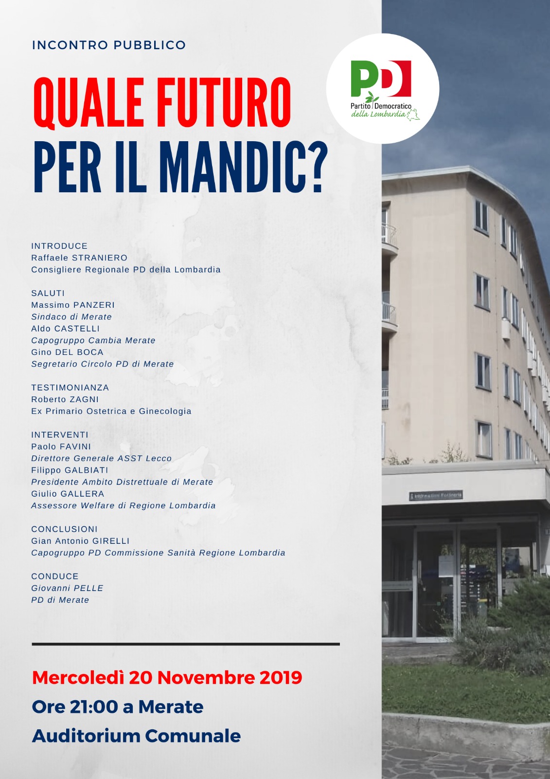 Che ne sarà del presidio ospedaliero di Merate? C’è veramente da temerne la chiusura dell’ospedale Mandic? E se continua l’emorragia di personale? Tutte domande alle quali da mesi cercano di darsi una risposta gli amministratori del territorio assieme ai cittadini e a un comitato in difesa dell’ospedale nato da poco. E di questo si parlerà stasera, mercoledì 20 novembre 2019, alle 21, nell’auditorium comunale di Merate, dove si terrà l’incontro pubblico proprio sul tema “Quale futuro per il Mandic?”, organizzato dal Gruppo regionale del Pd.