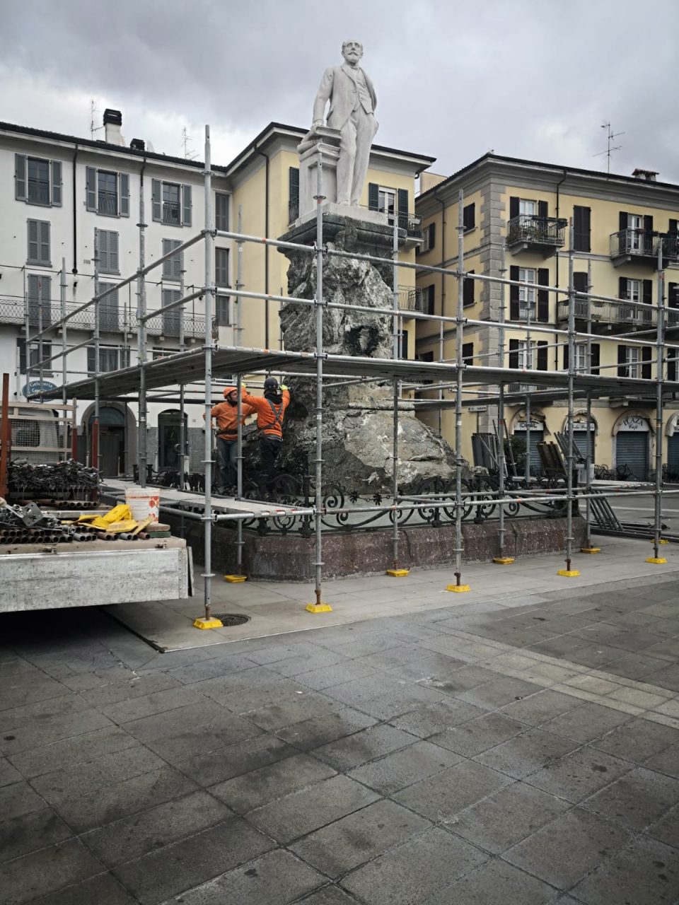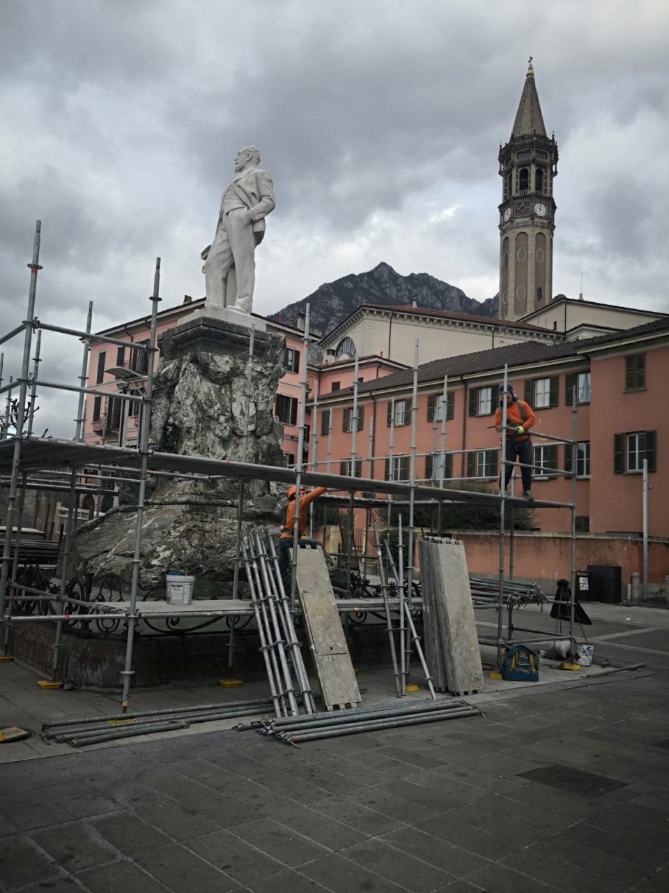 I lavori di installazione dei ponteggi in piazza Cermenati sono peraltro partiti proprio quest’oggi. Il compendio dedicato al naturalista e politico lecchese si compone di un alto piedistallo a foggia rocciosa sul quale è posto il ritratto scultoreo in marmo. La statua di Francesco Modena andò a sostituire l’originale effige bronzea realizzata da Mario Rutelli, requisita durante il secondo conflitto mondiale e utilizzata quale materia prima nella produzione bellica. Dopo le prime verifiche e analisi, seguirà la pulitura del granito, la stuccatura delle fessure, l’applicazione di uno specifico prodotto lichenicida ed eventualmente la stesura di un protettivo, nonché la ripresa delle lettere incise. I lavori proseguiranno fino a primavera inoltrata, in quanto le prime analisi comporteranno del tempo di inattività necessario alla restituzione di alcuni dati finalizzati alla corretta scelta dell’approccio operativo e dei prodotti consigliati dalla Soprintendenza.