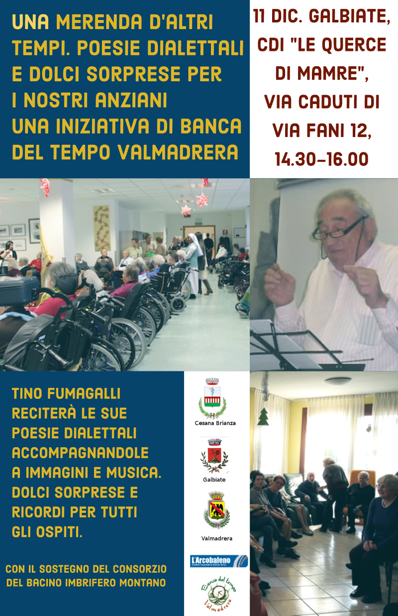 Fumagalli reciterà alcune sue poesie in dialetto lecchese, accompagnandole a sue fotografie e musiche, cercando il più possibile il dialogo con gli ospiti e i loro familiari. Al termine degli spettacoli ci sarà la merenda e Banca del Tempo offrirà ai presenti un ricordo della giornata, realizzato per l’occasione e accompagnato da una poesia del nostro socio-attore-poeta Tino Fumagalli. Lo scopo del progetto, che ha ottenuto il patrocinio dei comuni di Cesana Brianza, Galbiate e Valmadrera, nonché il sostegno del Consorzio del Bacino Imbrifero Montano, è quello di portare allegria ai nostri anziani, evidenziare le belle competenze della nostra rete e consolidare collaborazioni importanti con il territorio e diverse sue realtà.