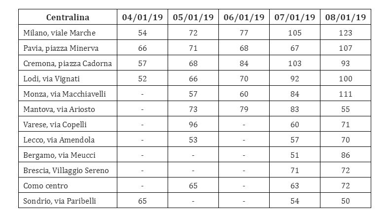 “Domani è un altro giorno era la frase simbolo del film Via col vento, ma sulla qualità dell’aria non si può procrastinare e sperare che sia, appunto, il vento a risolvere la situazione” Ne è convinta Legambiente Lombardia che sottolinea che per 5 giorni consecutivi la qualità dell’aria nelle province di Milano, Pavia e Cremona è stata pessima, con picchi molto al di sopra dei limiti di legge di 50 μg/m³, come per esempio i 123 microgrammi per metro cubo registrati a Milano in viale Marche domenica 8 gennaio. In provincia di Lecco, come segnalavamo ieri, la situazione è a ludi ed ombre: nella parte sud, quella del Meratese, lo smog è a livelli altissimi. Meglio a Nord anche se, come dimostra la tabella sotto, sforamenti delle soglie delle polveri sottili sono stati registrati anche a Lecco città.
