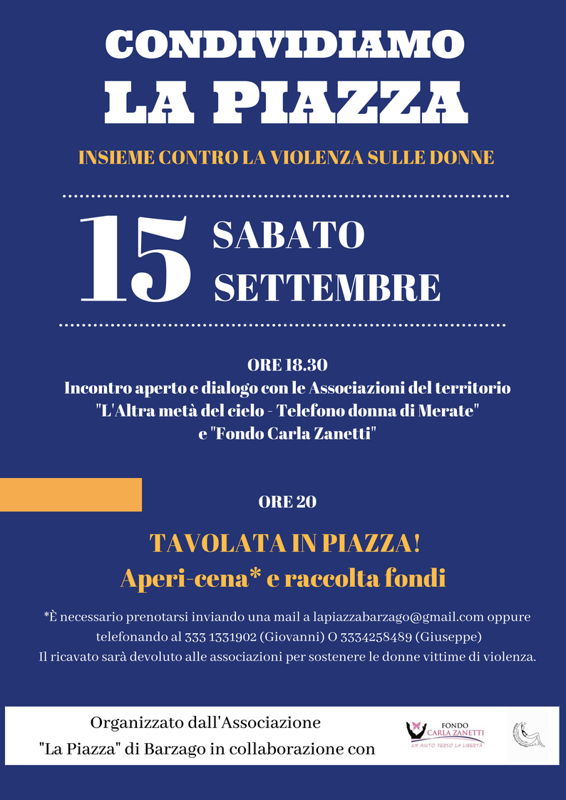 Alle 18.30 è previsto un momento di dialogo e incontro con le associazioni del territorio “L’altra metà del cielo – telefono donna di Merate” e “Fondo Carla Zanetti”, che operano in sostegno delle donne maltrattate, e a seguire un momento conviviale con una tavolata in piazza e un’apericena, per cui è consigliata la prenotazione scrivendo una mail all’indirizzo lapiazzabarzago@gmail.com. Durante la serata sarà attiva la raccolta fondi ed il ricavato sarà devoluto alle associazioni per il sostegno alle donne vittime di violenza.