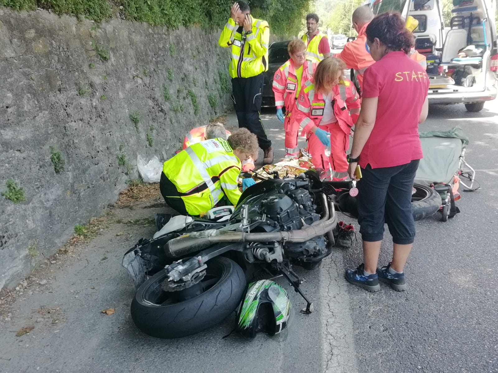 La macchina dei soccorsi si è messa in moto intorno alle 12.45. Sul posto, a sirene spiegate, sono intervenuti gli uomini del 118 a bordo dell’auto medica e i Volontari del Soccorso di Calolziocorte. Il motociclista, un 47enne,   è stato subito preso in cura sul posto e stabilizzato prima di essere trasferito sull’ambulanza  per essere trasportato in ospedale in codice giallo. Le ferite riportatte sarebbero quindi serie, ma fortunatamente l’uomo non sarebbe in pericolo di vita.
