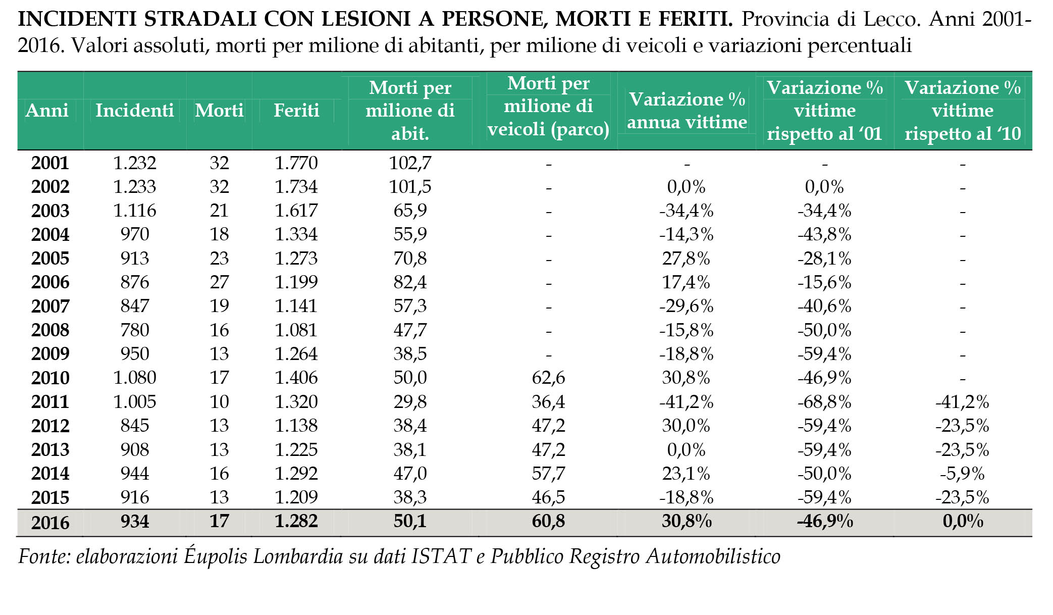 La nostra provincia ha fatto registrare un incremento del 31% del numero di morti tra il 2015 e il 2016.