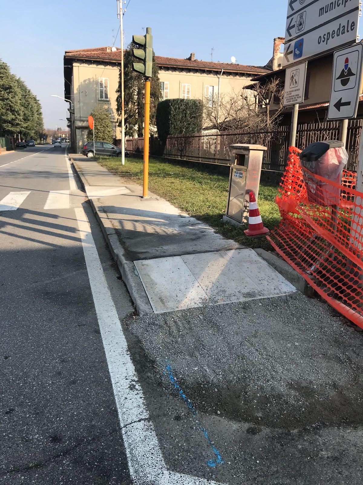 Incrocio di Brugarolo più sicuro grazie alla riqualificazione dei marciapiedi e dei passaggi pedonali.