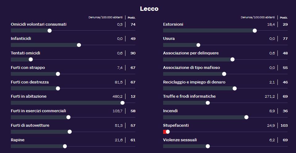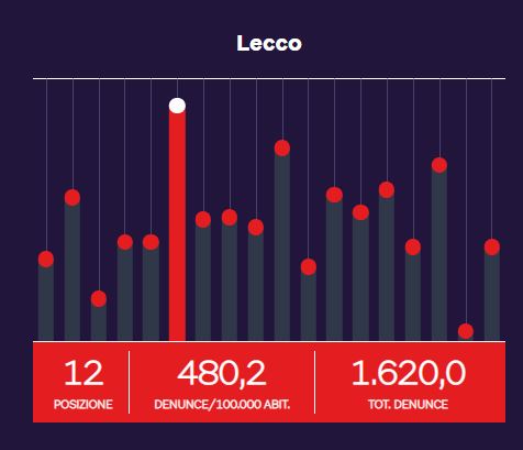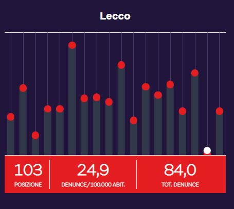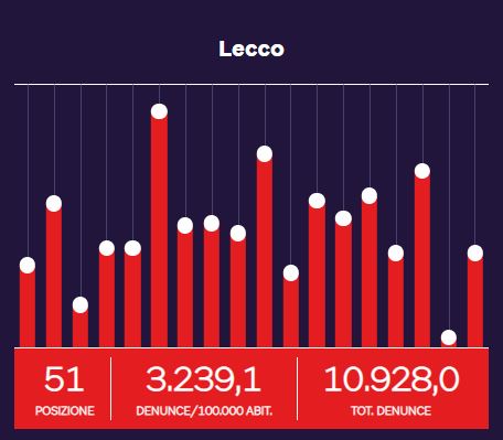 Indice di Criminalità: Lecco, nella classifica delle 106 province italiane, si posiziona al 51esimo. Nel 2018 sono state presentate 10.928 denunce, circa 3240 ogni 100mila abitanti. Lo scorso anno eravamo in 52esima posizione con 11.053 denunce. Lo rivela l’indagine nazionale del Sole 24 Ore su furti, rapine, estorsioni ed omicidi.