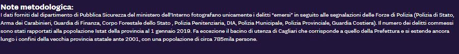L’indagine del noto quotidiano economico misura la qualità della vita nelle città e nelle province misurando l‘impatto ogni 100 mila abitanti di una serie di statistiche sull’ordine pubblico, e in particolare furti, rapine, truffe, estorsioni, usura, truffe e frode informatiche, secondo i dati forniti dal dipartimento di pubblica sicurezza del Ministero dell’Interno.