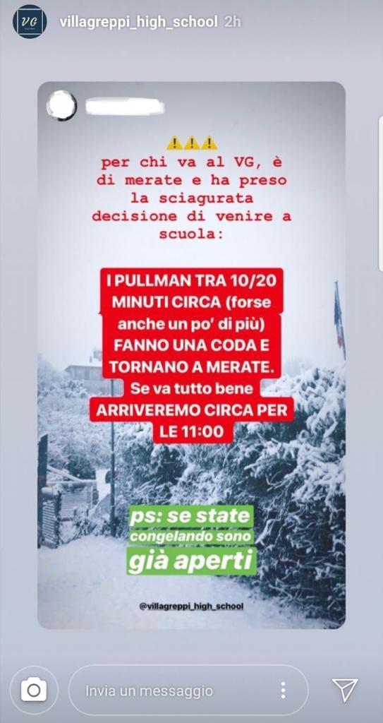Nella giornata di ieri, la Prefettura attraverso un comunicato, ha dato la possibilità ai sindaci dei singoli comuni di chiudere le scuole per rischio neve. La decisione del sindaco di Monticello Luca Rigamonti di chiudere i plessi scolastici, dalle elementari alle superiori, è arrivata però solo questa mattina. Le famiglie hanno quindi dovuto affrontare numerosi disagi e anche gli studenti di Villa Greppi hanno appreso la decisione della chiusura dell’istituto solo una volta giunti a scuola. L’ordinanza, infatti, come ha riportato l’istituto sul suo sito web ufficiale, è giunta alle 7.50 di questa mattina, quando molti alunni erano già all’interno dell’edificio o comunque già in viaggio verso Monticello. Tra i ragazzi c’è però chi l’ha presa con filosofia, sfruttando la pagina Instagram per pubblicare alcune foto e diramare l’avviso di chiusura della scuola e dei ritardi dei pullman.