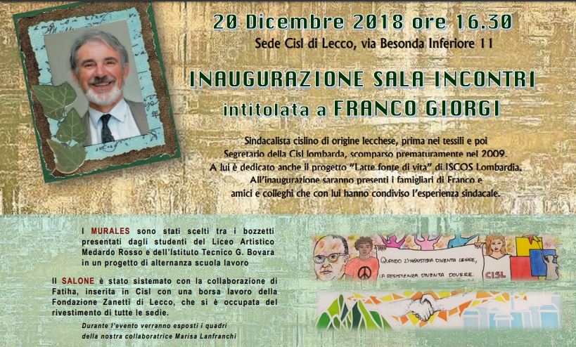 Giovedì 20 dicembre alle 16.30 sarà inaugurata la nuova sala incontri della sede Cisl di Lecco (via Besonda Inferiore 11). La sala sarà intitolata a Franco Giorgi.