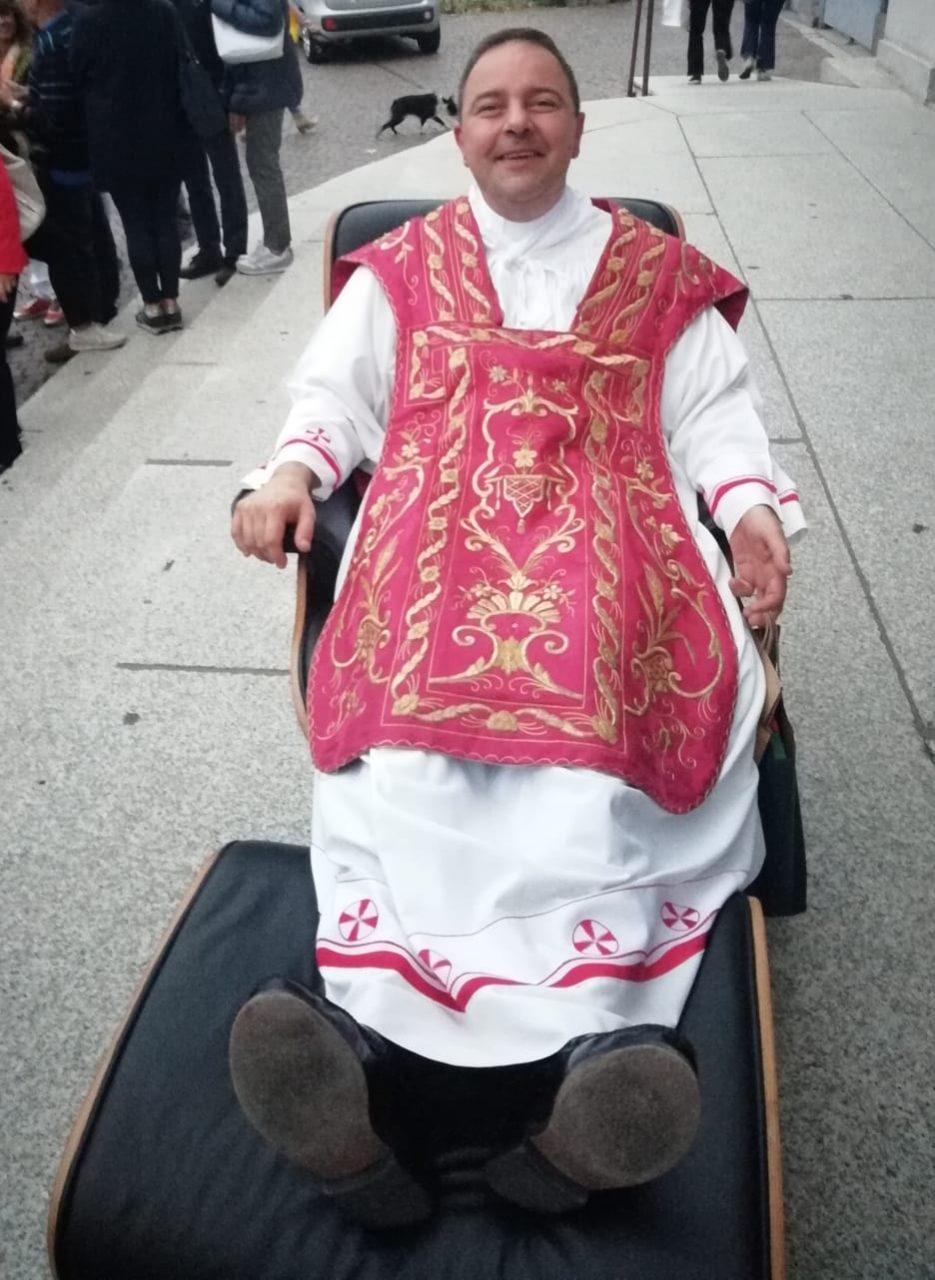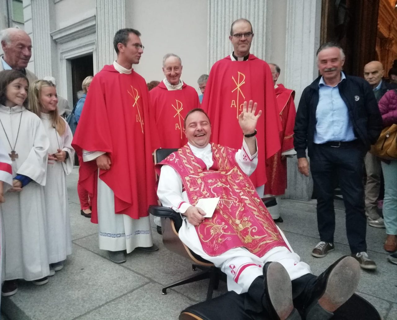 Al termine della funzione i parrocchiani hanno voluto regalare a don Paolo Ventura una poltrona, sulla quale il sacerdote si è simpaticamente accomodato come se si trovasse… su un trono.