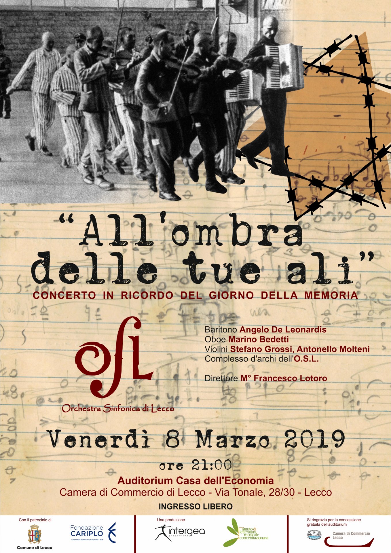 Questa sera, venerdì 8 Marzo 2019, alle 21 nell’l’Auditorium Casa dell’Economia (Camera di Commercio di Lecco – Via Tonale 28/30) di Lecco, si terrà il concerto “All’ombra delle tue ali” in ricordo del Giorno della Memoria. Il concerto prodotto da Intergea e dalla Fondazione Istituto di Letteratura Musicale Concentrazionaria (ILMC), è patrocinato dal Comune di Lecco e dalla Fondazione Cariplo. In programma musiche di Zrzavy, Schul, Goué, Coppola, Flothuis, Grunfeld, Kropinski, Hilsley, autori che hanno vissuto il dramma dei campi di prigionia e di sterminio della 2a Guerra Mondiale, all’interno dei quali la musica ha rappresentato per molte persone – poche delle quali sopravvissute – l’ultimo ma potente strumento di resistenza contro l’annientamento totale del corpo e della mente.