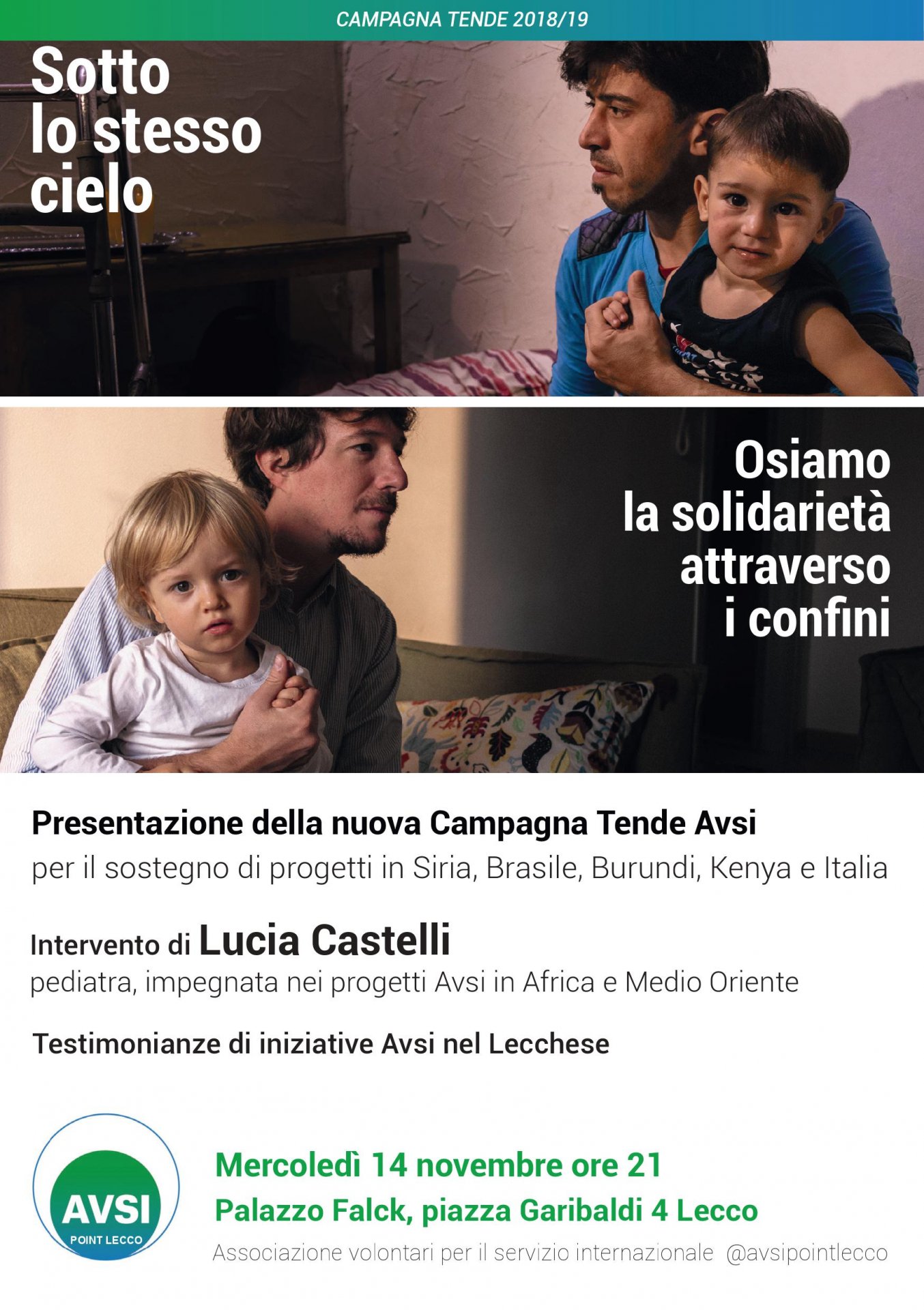 “Sotto lo stesso cielo. Osiamo la solidarietà attraverso i confini”. Lo stesso cielo di Lecco: perché sotto il titolo-slogan della Campagna Tende 2018/19 promossa da Avsi – Associazione volontari per il servizio internazionale, tra le maggiori Ong italiane -, anche Avsi Point Lecco avvia in questi giorni le prime iniziative di solidarietà a sostegno di quattro progetti in diverse parti del mondo. Il via ufficiale sarà stasera, mercoledì 14 novembre (ore 21 – Palazzo Falck, piazza Garibaldi, Lecco), quando saranno illustrate le finalità dei quattro progetti e sarà illustrato, anche attraverso alcune testimonianze, quanto già è stato fatto in questi mesi per la precedente Campagna Tende.