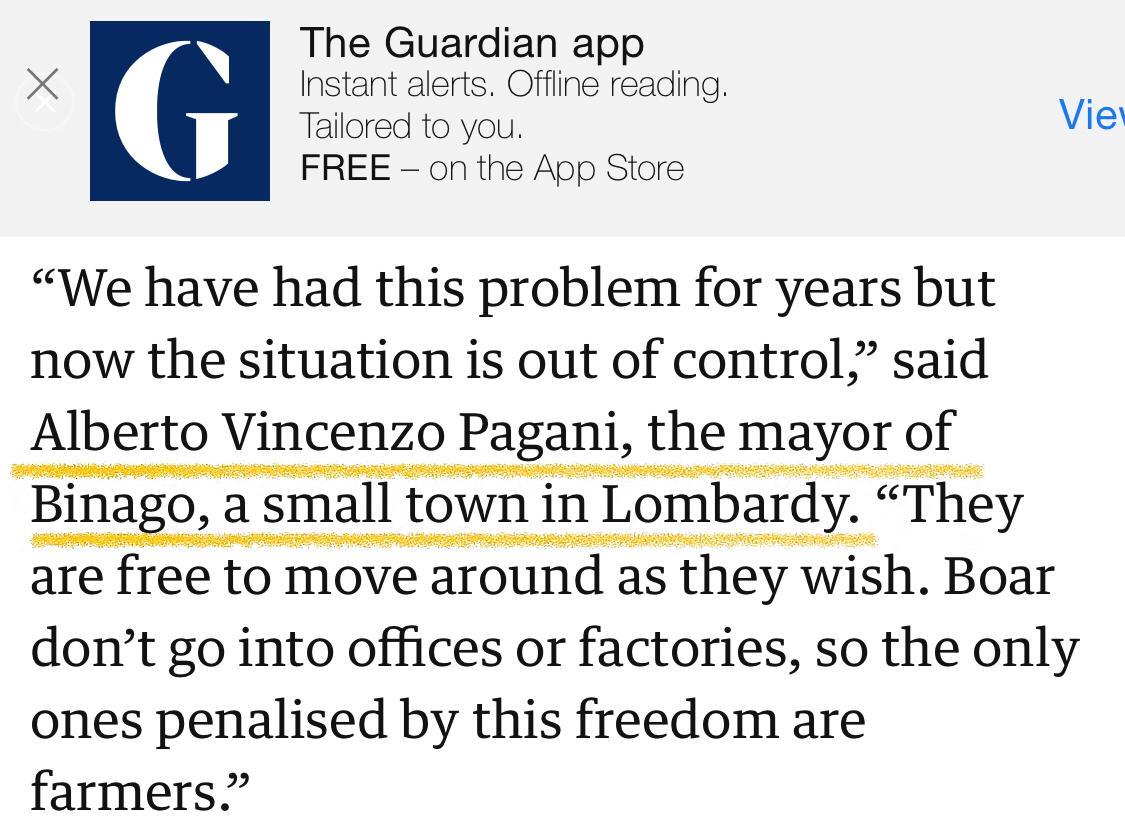 L’allarme cinghiali che flagella il territorio di Como-Lecco esce dai confini: l’autorevole quotidiano londinese internazionale “The Guardian”, che ieri ha raccontato la manifestazione di Coldiretti in piazza Montecitorio a Roma, riporta le dichiarazioni di Alberto Pagani, imprenditore agricolo e sindaco di Binago, ieri tra i coltivatori lariani scesi nella capitale: “We have had this problem for years but now the situation is out of control,” riporta il quotidiano citando il primo cittadino. “They are free to move around as they wish. Boar don’t go into offices or factories, so the only ones penalised by this freedom are farmers.” (“Abbiamo avuto questo problema per anni, ma ora la situazione è fuori controllo” ha detto Pagani, riferendo che i selvatici, liberi di muoversi come desiderano, non entrano in uffici o fabbriche e penalizzano quindi, in primis, la categoria degli agricoltori).