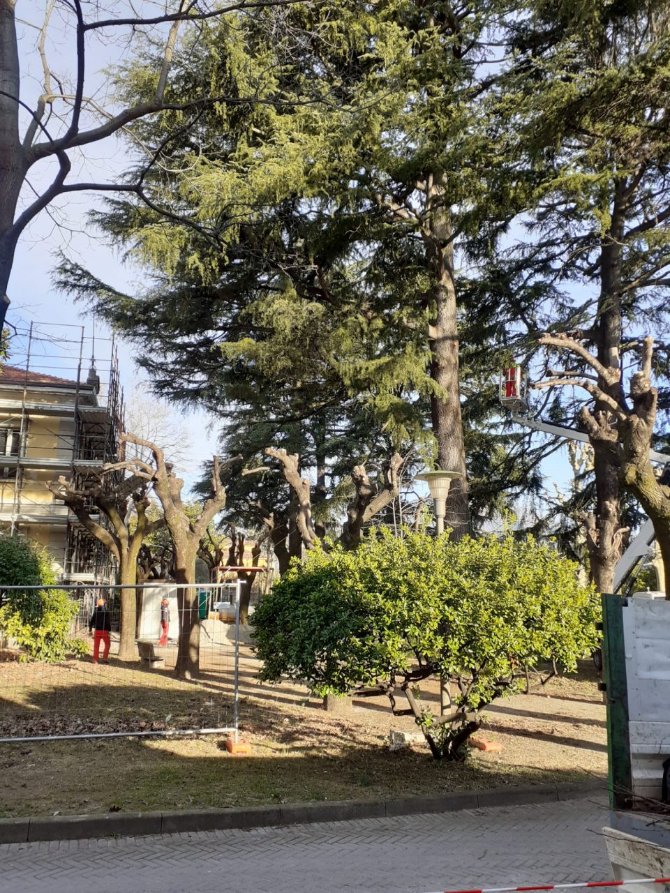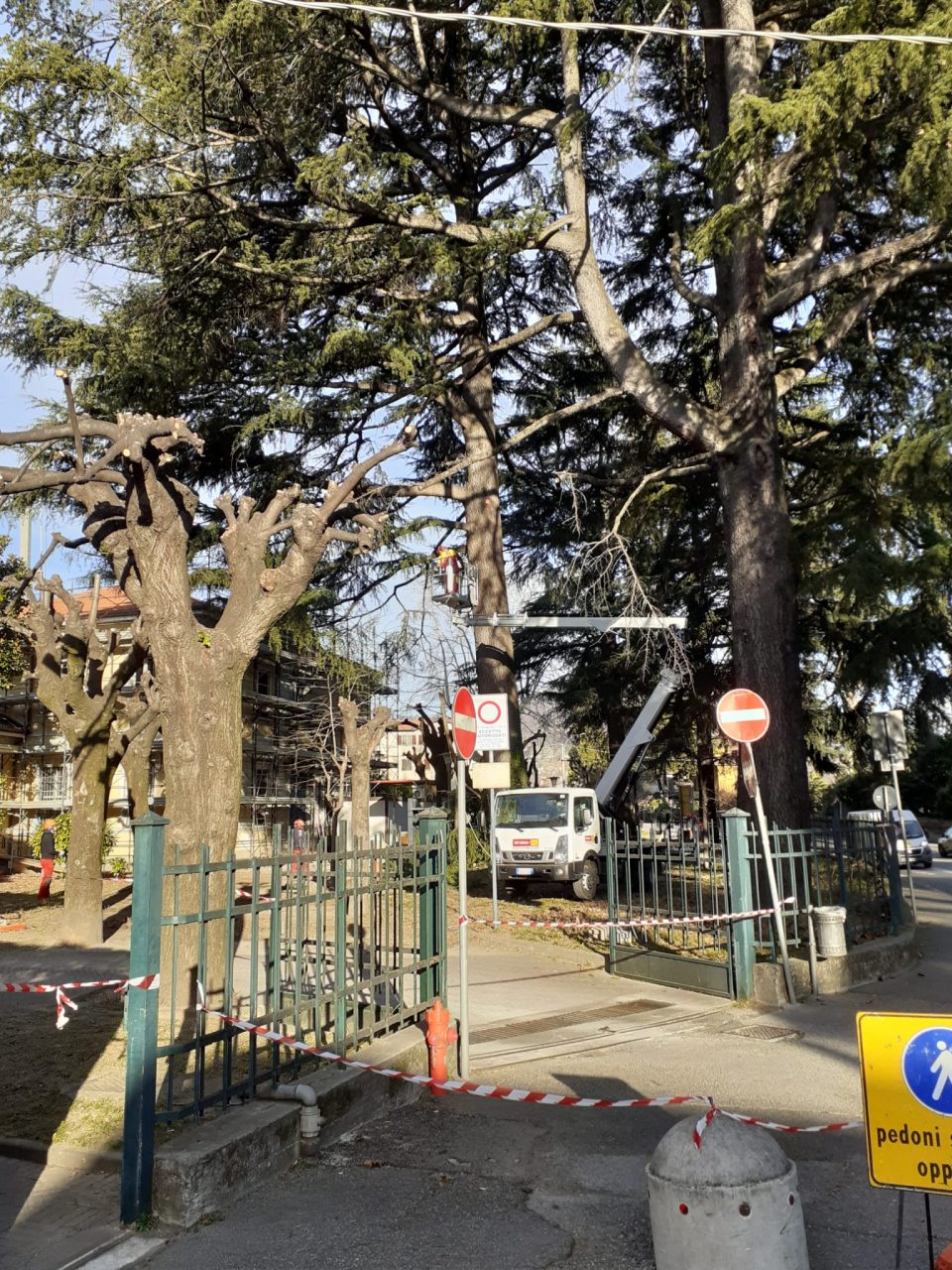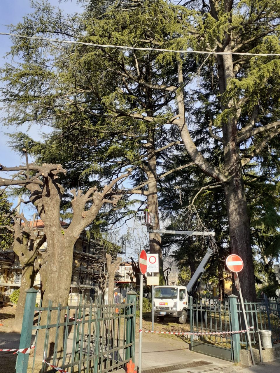Sono iniziati oggi, giovedì 27 febbraio, i lavori di abbattimento dei sei esemplari di cedro dell’Hymalaya, alti fra i 15 e i 20 metri, che svettano da decenni davanti all’edificio dell’ex municipio di Olginate. Una decisione sofferta, ma necessaria per garantire la massima sicurezza. A confermarlo sono stati tanto il sindaco Marco Passoni quanto l’agronomo Elia Galbusera in una commissione ad hoc per spiegare i motivi che hanno portato a questa scelta. Nel frattempo in tanti hanno espresso la loro contrarietà contro la decisione dell’Amministrazione, tra cui il gruppo di minoranza “Olginate si Cambia” e anche diversi cittadini. Addirittura sul muro a fianco dell’ex sede del Comune, nei pressi della statua di San Carlo, all’imbocco del ponte sull’Adda è comparso ieri, mercoledì 26 febbraio, questo eloquente slogan: “+ 5 g- radiazioni, alberi e aria nei polmoni, grazie Comune”.