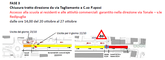 La terza e ultima fase dei lavori è prevista a seguire e comporterà dalle 14 di sabato 20 ottobre alle 12 di sabato 27 ottobre l’istituzione del divieto di transito nel tratto compreso tra corso Promessi Sposi e via Tagliamento, limitatamente alla direttrice Tagliamento/Tonale. Sarà garantito l’accesso alla scuola, ai residenti e alle attività commerciali da viale Redipuglia a via Tonale: