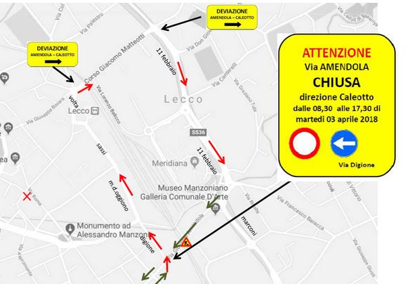 Gli automobilisti e i motociclisti in transito saranno deviati, anche grazie alla segnaletica di cantiere, su via Digione e raggiungeranno corso Matteotti attraverso via Marco d’Oggiono e via Sassi, per poi procedere sino a largo Caleotto percorrendo via 11 febbraio.