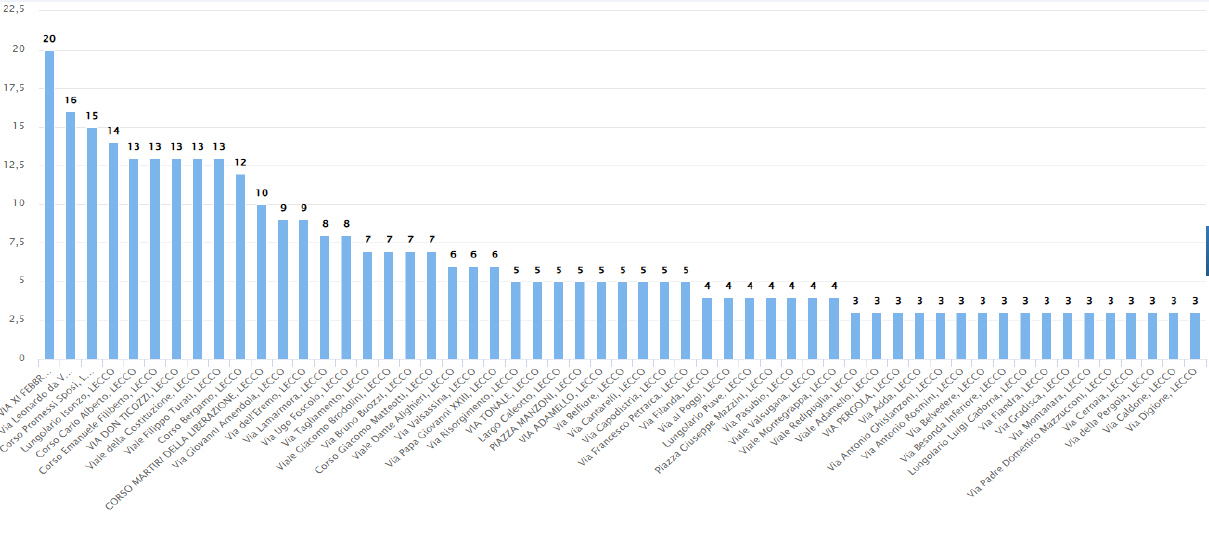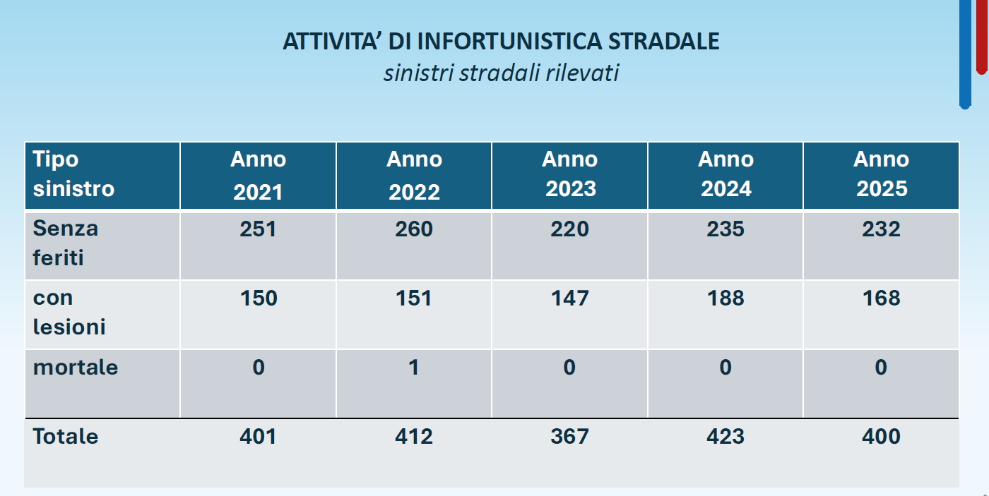 La sicurezza stradale ha rappresentato un altro importante ambito di attività. Nel 2025 sono stati rilevati complessivamente 400 incidenti stradali, un numero stabile rispetto all’anno precedente. Di questi, 232 incidenti sono stati senza feriti, mentre 168 hanno comportato lesioni. Fortunatamente, non si sono registrati sinistri mortali. L’azione della Polizia Locale ha incluso anche l’accertamento dei reati in materia di circolazione stradale, con un incremento significativo dei casi di guida in stato di ebbrezza, passati da 1 nel 2024 a 11 nel 2025, mentre sono diminuiti i casi di omissione di soccorso e le lesioni personali gravi. Nella classifica delle strade più pericolose, ovvero quelle dove si registrano più incidenti spiccano corso via XI Febbraio, via Leonardo da Vinci, corso Promessi sposi, Lungolago, corso Carlo Alberto e corso Emanuele Filiberto.