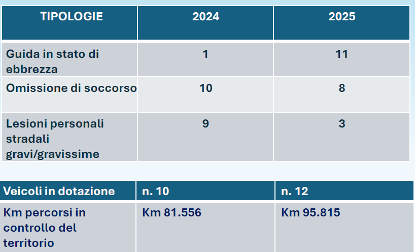 Il corpo ha inoltre svolto un’intensa attività di controllo delle violazioni al Codice della Strada, accertando complessivamente 35.788 infrazioni, in aumento rispetto alle 30.189 del 2024. Tra le violazioni più frequenti, si segnalano la circolazione con veicolo senza revisione, passata da 158 a 164 casi, le violazioni delle norme di comportamento alla guida, salite da 1.952 a 2.104, e le infrazioni legate alla conduzione di monopattini elettrici, raddoppiate rispetto all’anno precedente.
