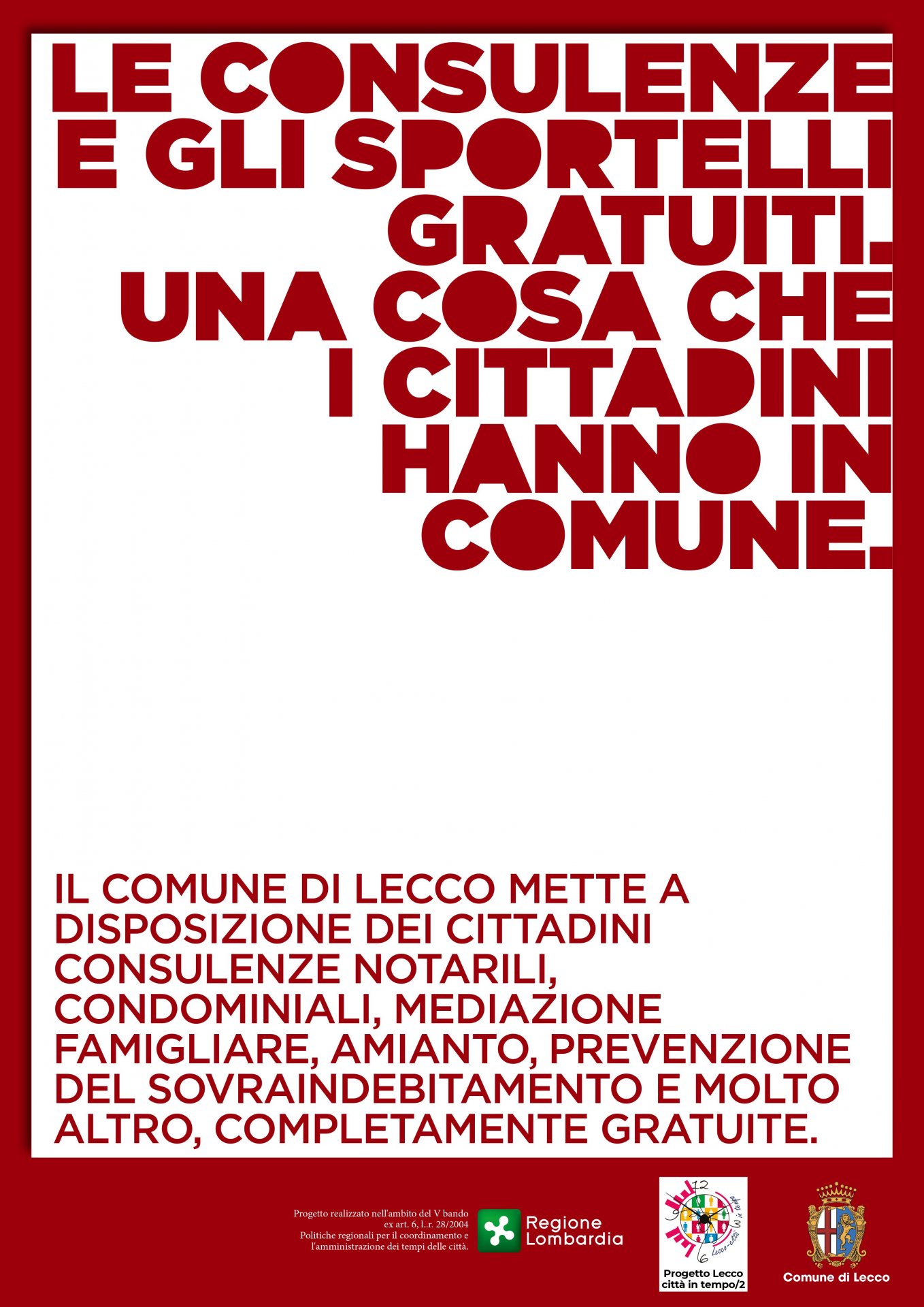 ipartono con il mese di gennaio le consulenze gratuite erogate presso gli sportelli informativi attivati in municipio grazie alla collaborazione delle associazioni professionali e di volontariato in favore dei cittadini di Lecco e della sua provincia.